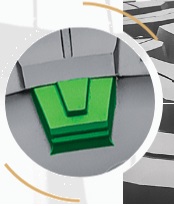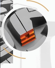 Blocurile de rulare robuste și rigide au suporturi coborâtoare pe blocurile centrale pentru a oferi rigiditate modelului benzii de rulare în zona de contact, sporind stabilitatea și manevrarea, prevenind în același timp blocarea pietrelor în caneluri.